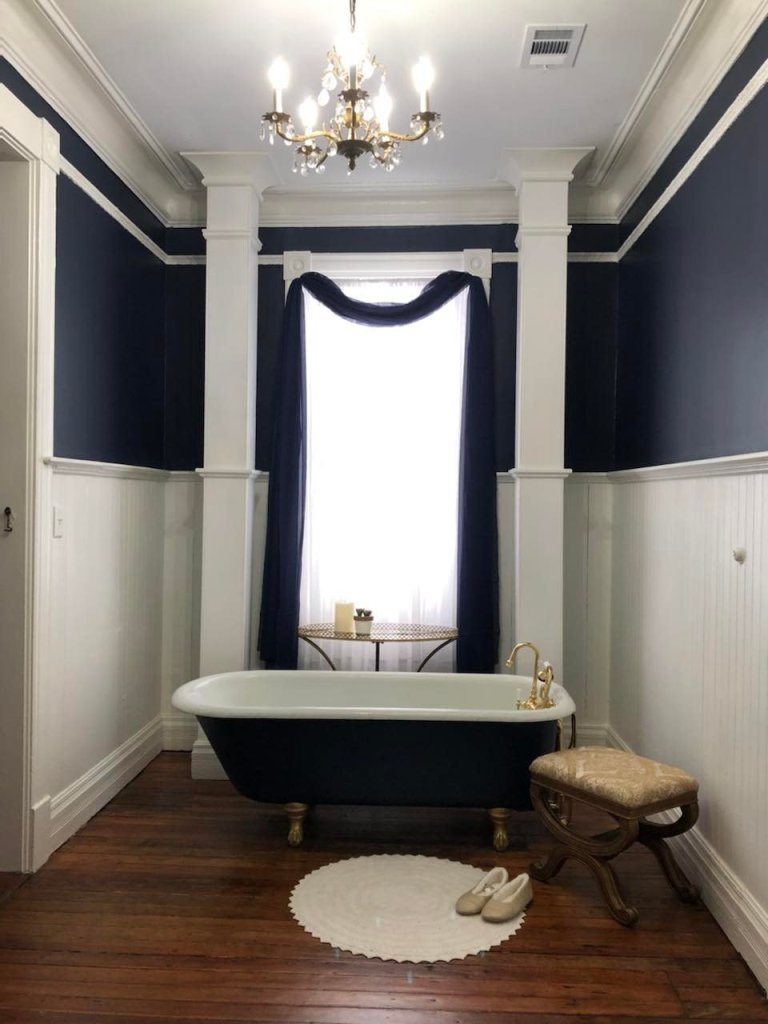 Attached to the primary bedroom, this private bathroom features a clawfoot tub and is a favorite photo spot for guest brides.